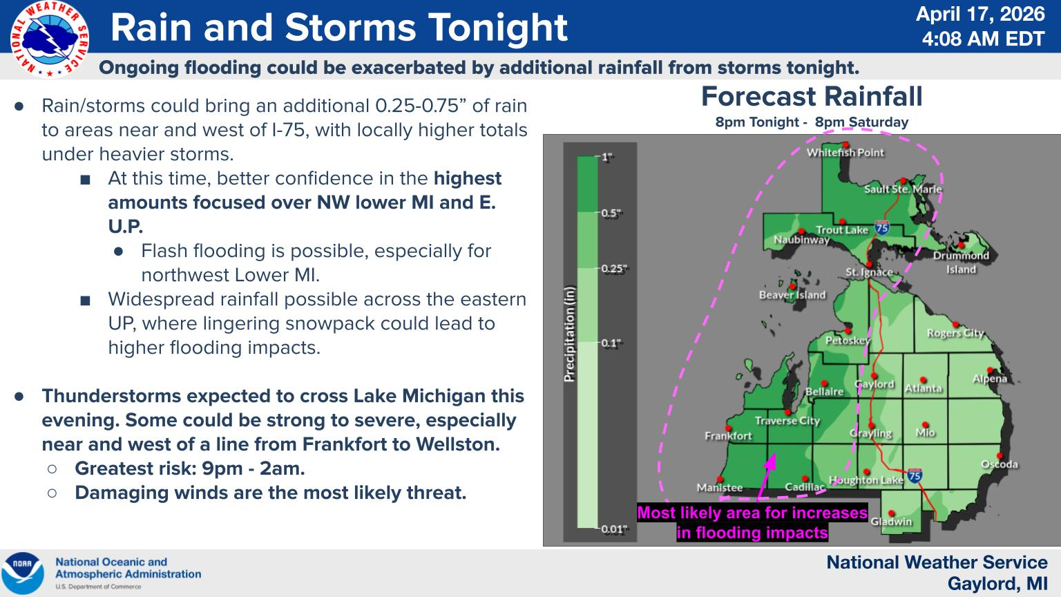 While today will be clear, the next round of weather arrives late Friday into Saturday as a cold front brings showers and thunderstorms to northern Michigan. Rainfall of up to three-quarters of an inch is expected, which could worsen ongoing flooding. While severe storms are unlikely, a few stronger cells are possible. Flood Watches remain in effect for most of northwest lower Michigan and the eastern U-P. Behind the system, much colder air moves in, with highs in the 40s and even a chance of lake-effect snow. Drier weather returns early next week, offering some relief.