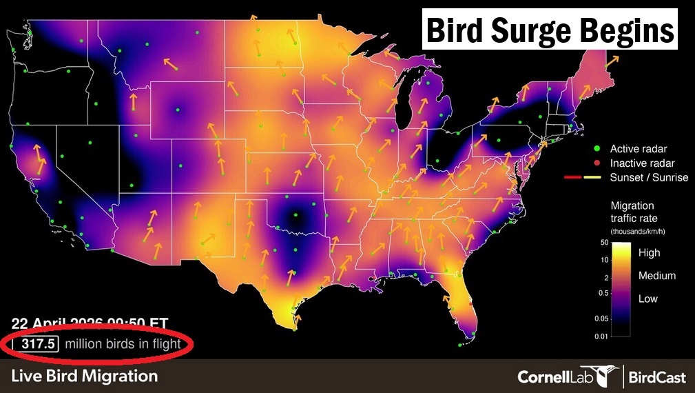 Today’s Featured Image: With Warblers on the Water just a month away, the migration north has begun. A BirdCast graphic depicts birds on the move. Graphic from CornellLab Birdcast from Facebook post |