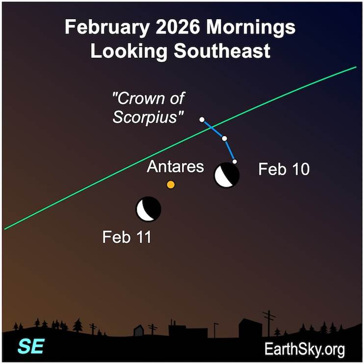 In our Dark Skies, Wednesday morning, the waning crescent moon will be near the bright red star Antares. It’s the brightest star in the constellation of Scorpius the Scorpion. There’s more info at dark sky island dot org.