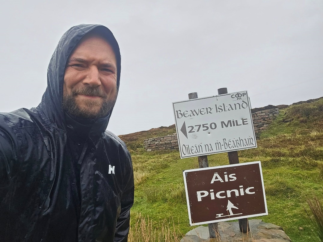 Today’s featured image: WVBI’s Jackson Smith pays a visit to the Twinning Memorial on Arranmore in suboptimal conditions. Reports are that he did not picnic there. Photo by Jackson Smith |